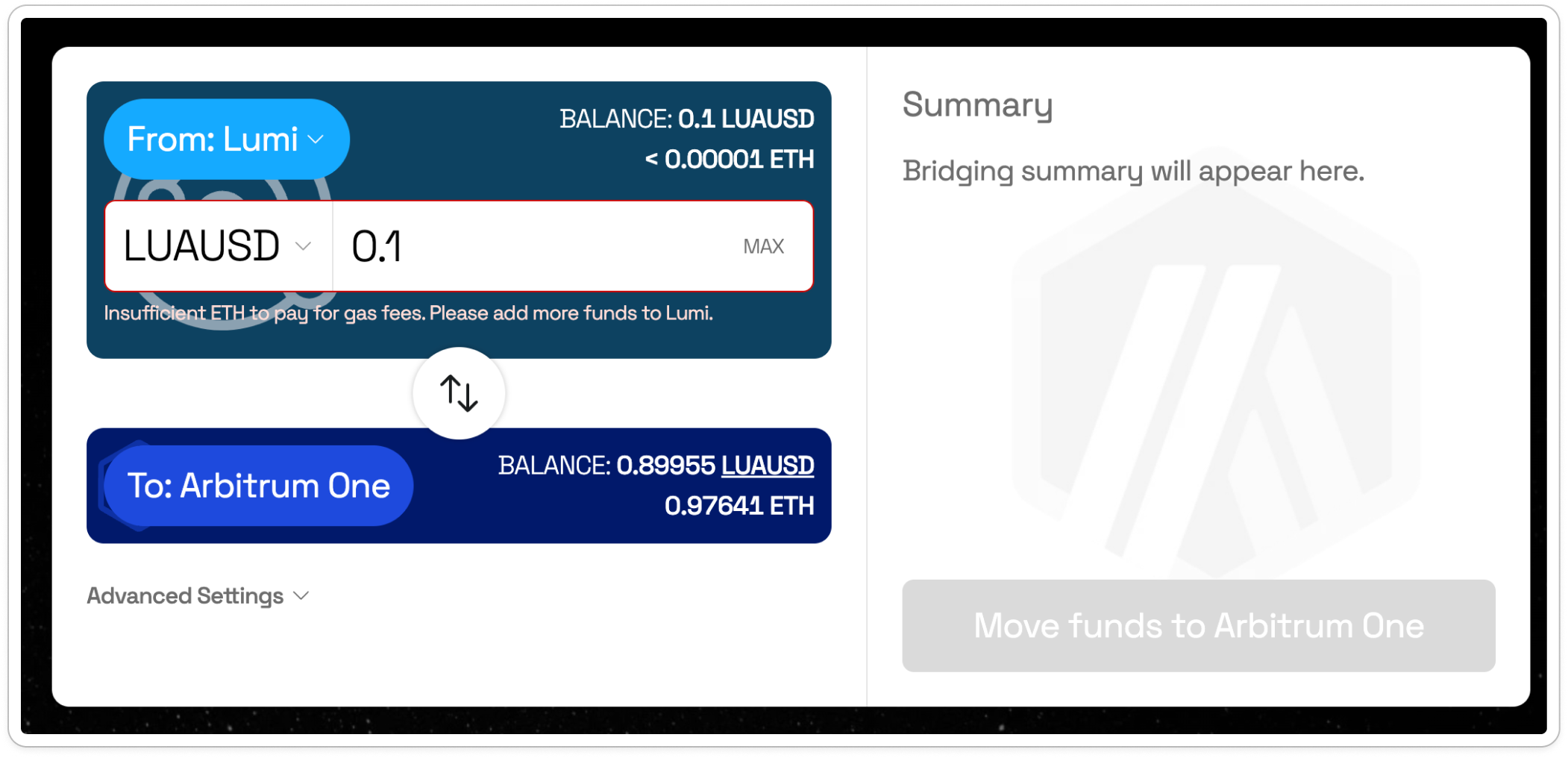 Before bridging in, you need to have some ETH in your Arbitrum One (for gas fee), we fork the official bridging function, support LUAUSD token and Lumi L3 by default.