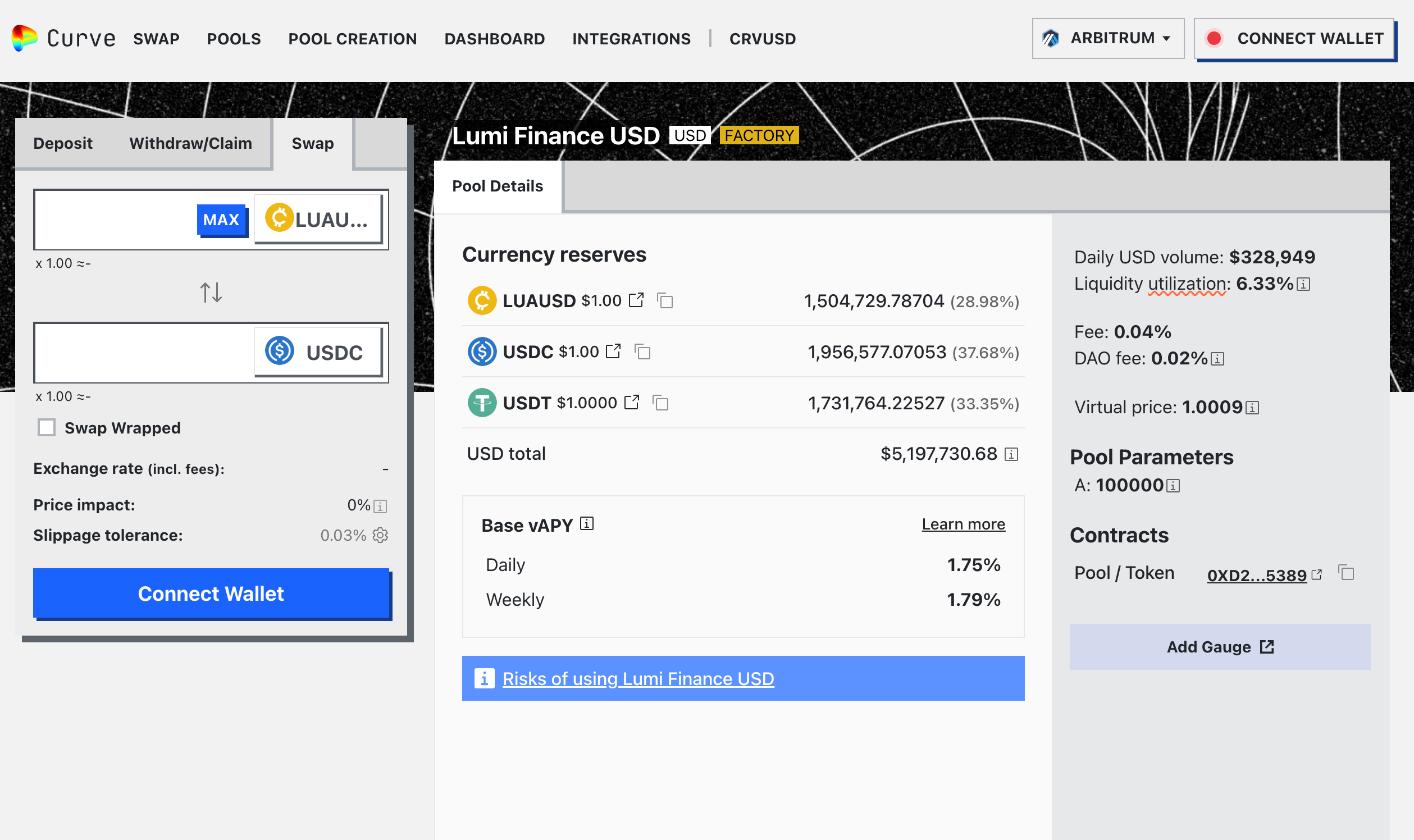 One way is  to visit [Lumi Finance USD Pool](https://curve.fi/#/arbitrum/pools/factory-v2-138/swap) in Curve, swap $LUAUSD  with USDT/USDC