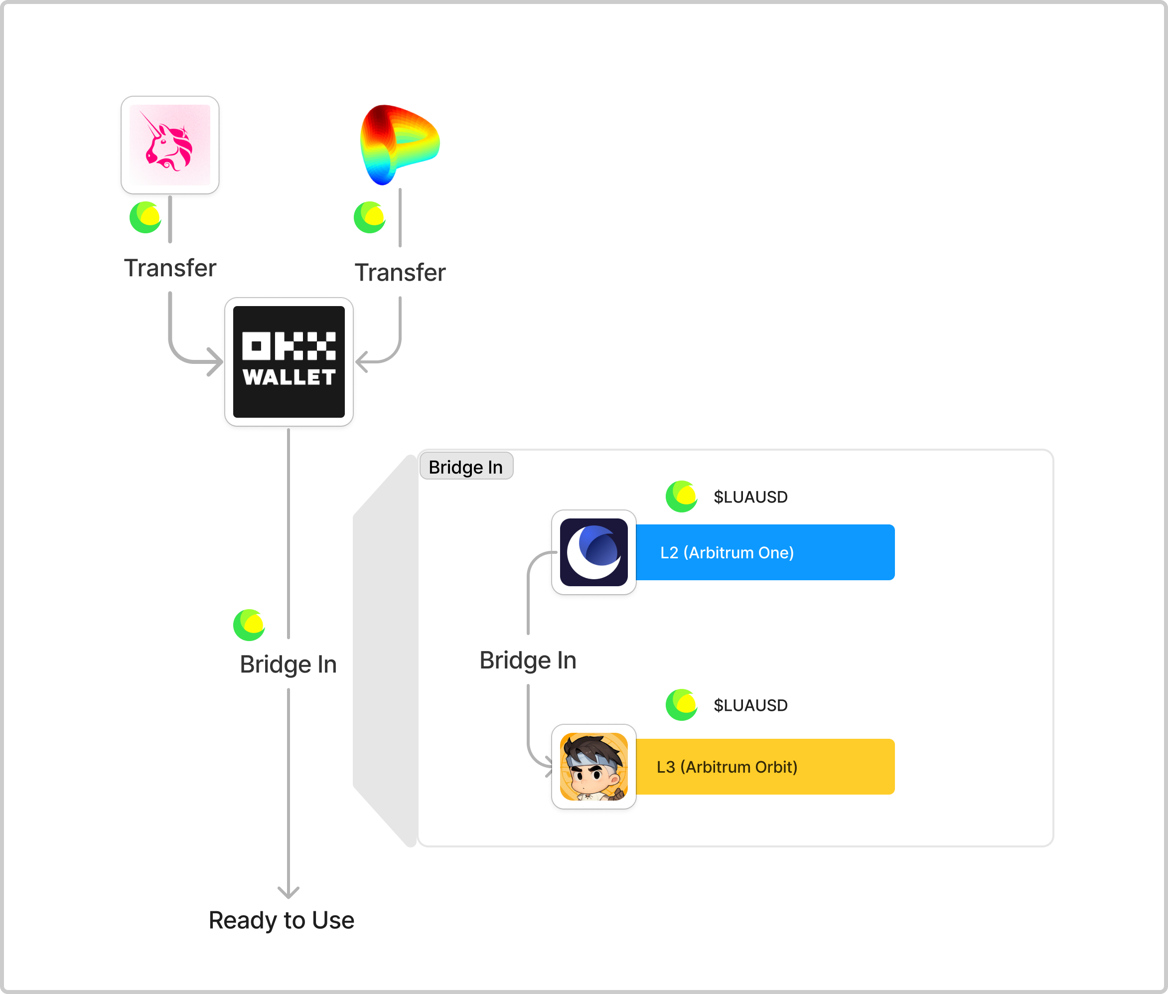 Visit the [Official Arbitrum Bridge Fork](https://bridge.layerlumi.com/?l2ChainId=94168)  (<https://bridge.layerlumi.com/?l2ChainId=94168>) to bridge in or bridge out your $LUAUSD